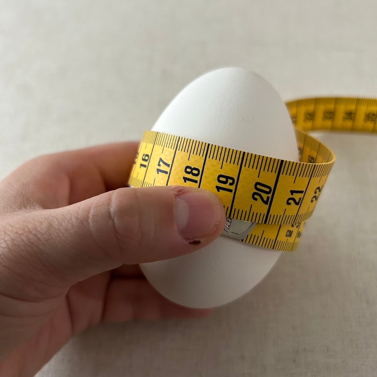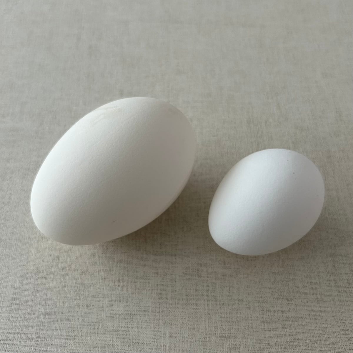 グース(ガチョウ)の卵です。中身は小さな穴から出してありますので、すぐにピサンキの材料としてお使いいただけます。2枚目の写真はニワトリの卵との大きさ比較。メジャーで測ってみた画像も入れましたが、自然のものですので形や大きさには個体差があります。